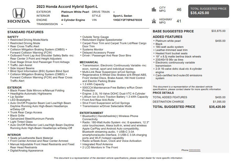 Jake Sweeney Is Here to Help! If you are in need of a new or used vehicle, we are offering you the ability to shop online and have your vehicle delivered to your home. Platinum White Pearl 2023 Honda Accord Hybrid Sport-L FWD eCVT 2.0L 16V DOHC 2.0L 16V DOHC.