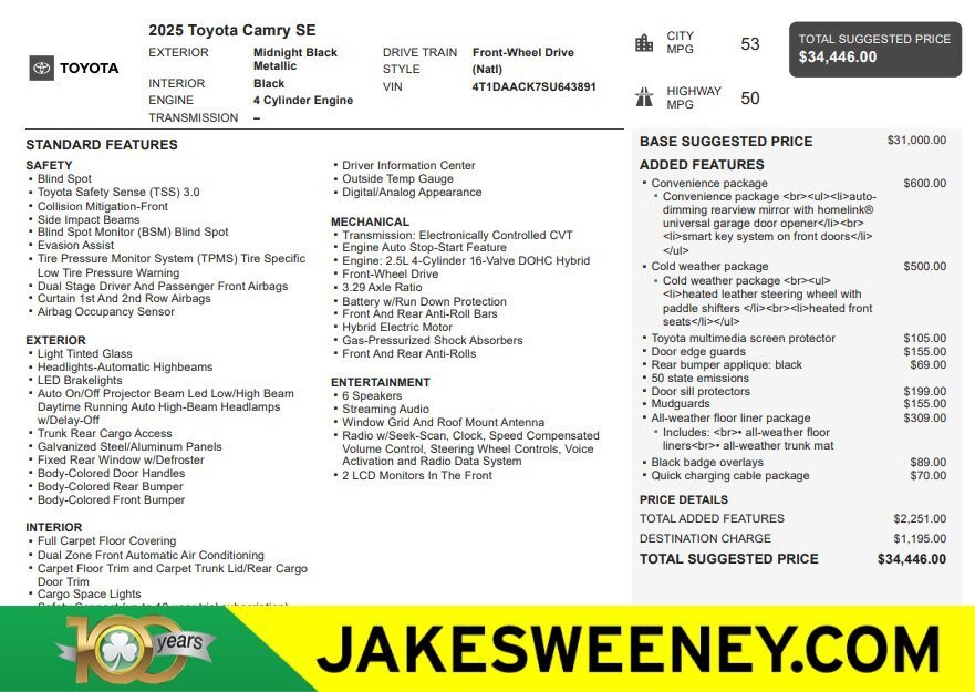 Jake Sweeney Is Here to Help! If you are in need of a new or used vehicle, we are offering you the ability to shop online and have your vehicle delivered to your home. Black 2025 Toyota Camry FWD eCVT 2.5L 4-Cylinder 16V DOHC 2.5L 4-Cylinder 16V DOHC.Recent Arrival!