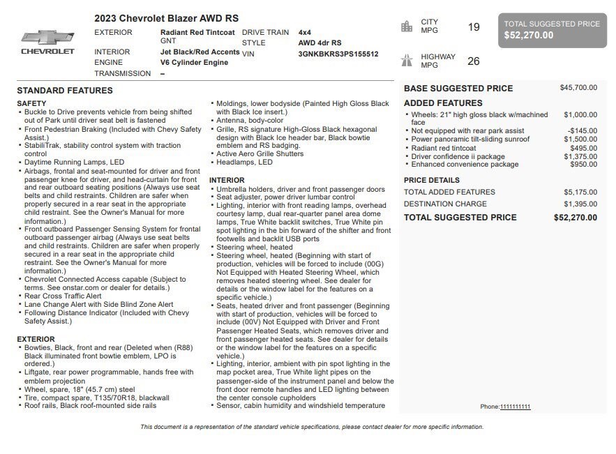 Jake Sweeney Is Here to Help! If you are in need of a new or used vehicle, we are offering you the ability to shop online and have your vehicle delivered to your home. Radiant Red Tintcoat 2023 Chevrolet Blazer RS AWD 9-Speed Automatic with Overdrive 3.6L V6 SIDI SUNROOF, AWD, Adaptive Cruise Control, Driver Confidence II Package, Enhanced Automatic Emergency Braking, Enhanced Convenience Package, HD Surround Vision, Heated Rear Outboard Seating Positions, Heated Steering Wheel, Memory Settings For Driver Seat & Exterior Mirrors, Power Tilt & Telescoping Steering Column, Preferred Equipment Group 1RS, Rear Camera Mirror, Rear Camera Mirror Washer, Rear Park Assist w/Audible Warning, Safety Alert Seat, Ventilated Driver & Front Passenger Seats, Wheels: 21" High Gloss Black w/Machined Face.Recent Arrival! Odometer is 27051 miles below market average! 19/26 City/Highway MPG