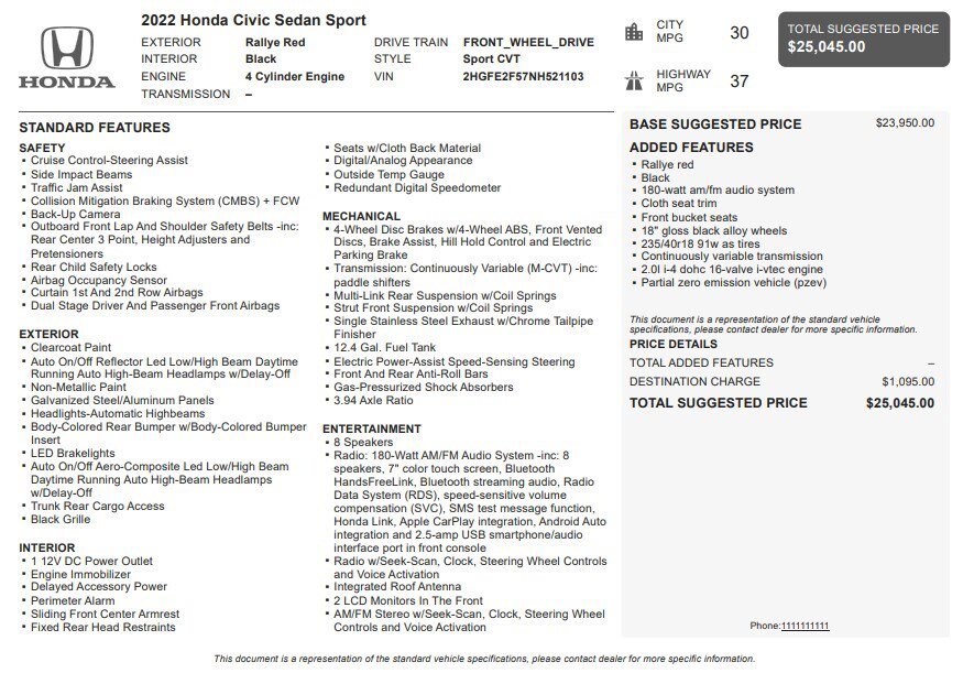 Jake Sweeney Is Here to Help! If you are in need of a new or used vehicle, we are offering you the ability to shop online and have your vehicle delivered to your home. 2022 Honda Civic Sport FWD CVT 2.0L I4 DOHC 16V i-VTEC Cloth.