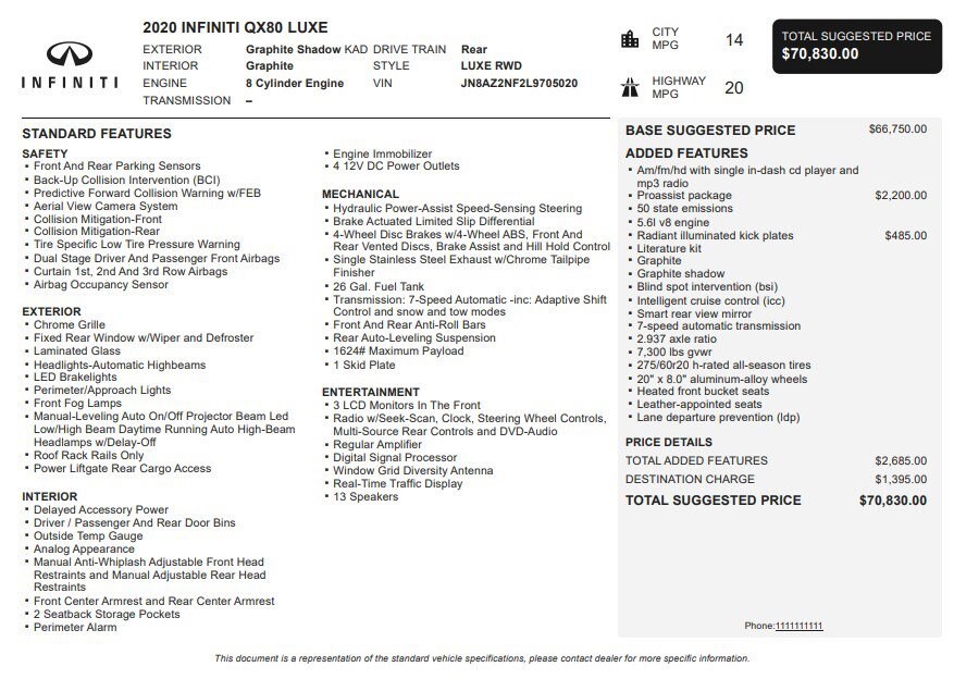 Jake Sweeney Is Here to Help! If you are in need of a new or used vehicle, we are offering you the ability to shop online and have your vehicle delivered to your home. Graphite Shadow 2020 INFINITI QX80 LUXE RWD 7-Speed Automatic 5.6L V8Recent Arrival!
