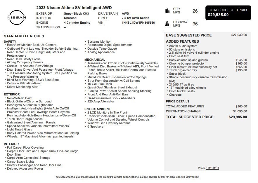 Jake Sweeney Is Here to Help! If you are in need of a new or used vehicle, we are offering you the ability to shop online and have your vehicle delivered to your home. Super Black Clearcoat 2023 Nissan Altima 2.5 SV AWD CVT with Xtronic 2.5L 4-Cylinder DOHC 16V CVT with Xtronic.